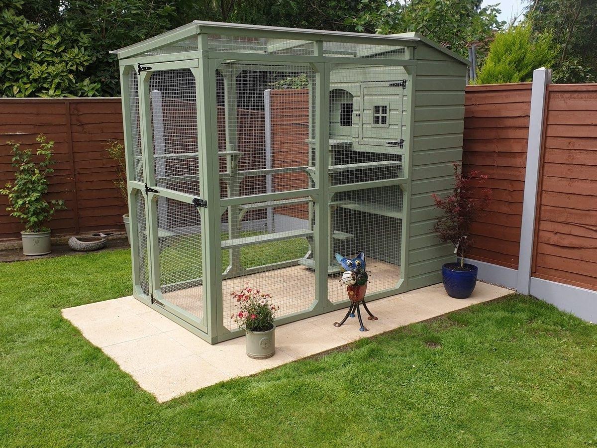 Example: A galvanized steel aviary with a pitched roof and integrated drainage system.